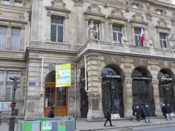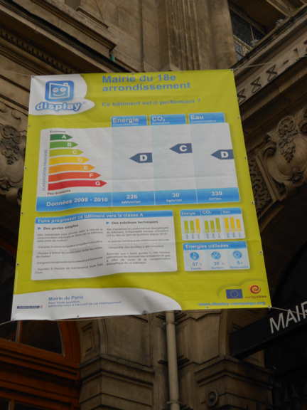 Public buildings are required to display an energy performance certificate, as mandated by the recast of the EU Energy Performance of Buildings Directive. This is required for all buildings larger than 500 square metres. That threshold will drop to 250 square metres in 2015. The city hall of the 18th district (arrondissement) of Paris (where Montmartre is and close to the EiD office) has gone all out with an enlarged certificate that hangs on the outside of the building.