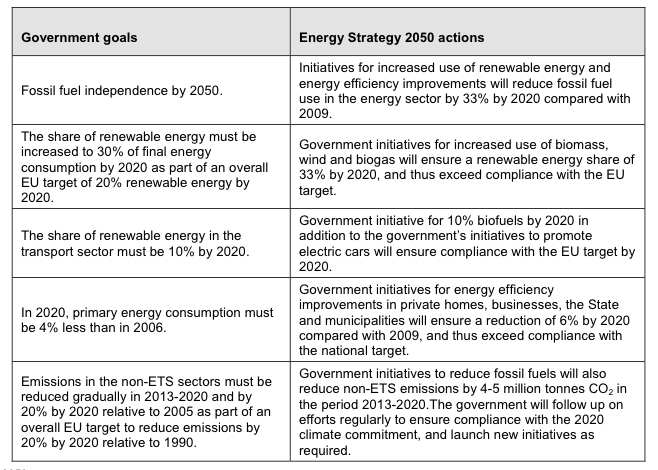 Energy policy is based on Denmark’s Energy Strategy 2050 that was published in 2011. The strategy sets the goal of making Denmark independent of fossil fuel use by 2050 and it calls for a major contribution from improved energy efficiency and renewable energy. The strategy is based on three phases: the transition phase; preparation and planning of the next phase followed by the utilisation and integration of new solutions; and the technology development phase, requiring investment in research, development and demonstration of cost-effective energy technologies followed by large-scale demonstration and preparation for market, and then finally market integration.