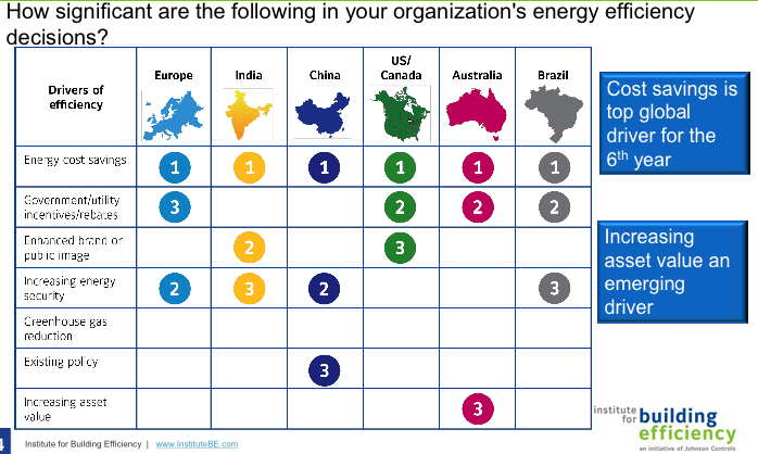 While there is much valuable information from this survey, one finding on the drivers for energy efficiency was particularly interesting. Note, that greenhouse gas emissions reduction was not a priority in any region, but reducing energy costs certainly was.