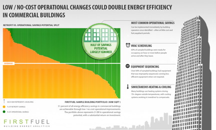 The FirstFuel analysis revealed that 51 percent of all energy efficiency opportunities from the sample – representing approximately $12 million in total savings – could be achieved through low and no-cost operational improvements. When extrapolated to the entire U.S. commercial building market, the total savings potential for operational improvements represents a $17 billion opportunity.