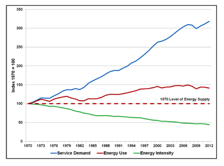 The blue line illustrates demand for energy services (the economic activity associated with energy use) since 1970; the solid red line shows energy use; and the green line illustrates the gain in energy efficiency. While demand for energy services has tripled in the last four decades, actual energy consumption has only grown by 40 percent. Meanwhile, the energy intensity of our economy has fallen by half.