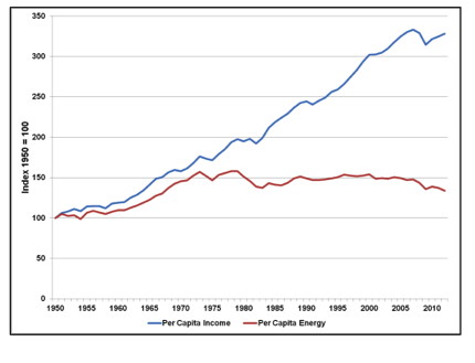 And here’s another telling statistic about the impact of efficiency: while per capita energy use is only 34 percent higher than it was in 1950, per capita income has increased 84 percent since then.