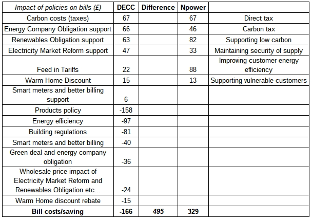 The table below shows how Npower and the DECC expects policies to effect bills: