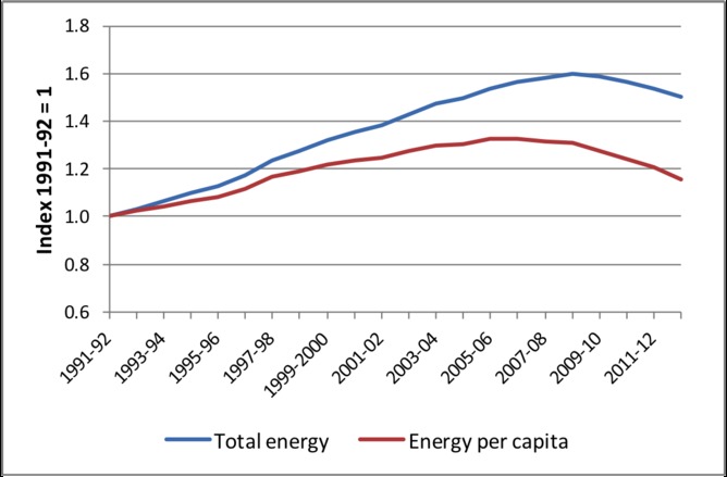 For several decades, ending around 2006, Australia has had steady growth in output of primary metals and other electricity intensive commodities, and this drove a steady increase in electricity consumption. This growth ceased in 2006.