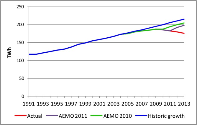 Until 2010, for well over a century, through two world wars and the Great Depression, the quantity of electricity used in Australia each year was greater than the year before. In the three years since 2010, the quantity used each year has been less than the year before. There is no evidence this trend will reverse in coming months.