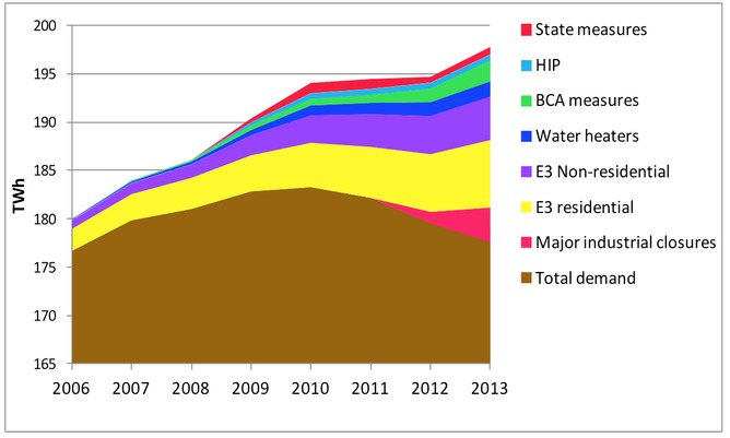 If all the above contributions to reduced electricity demand are added to actual demand, starting in 2006, the result is a series of total annual numbers, which can be thought of as total demand for electricity services. This includes both actual electricity and services provided by using a given quantity of electricity more efficiently. We found that demand defined and calculated in this way (and also including the reductions from the major industry closures) closely tracks the historical trend growth in electricity demand, up to 2010 . Since then, however, there has been a marked departure from trend.