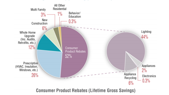 Based on these totals, LBNL reports the average levelized CSE of energy efficiency programs is just $0.021/kWh, with a first year CSE of $0.16/kWh. Residential efficiency programs spent $1.5 billion and had the lowest CSE at a national level, with $0.018/kWh, and efficient lighting rebate programs represented at least 44% of total 109,929GWh gross lifetime savings.