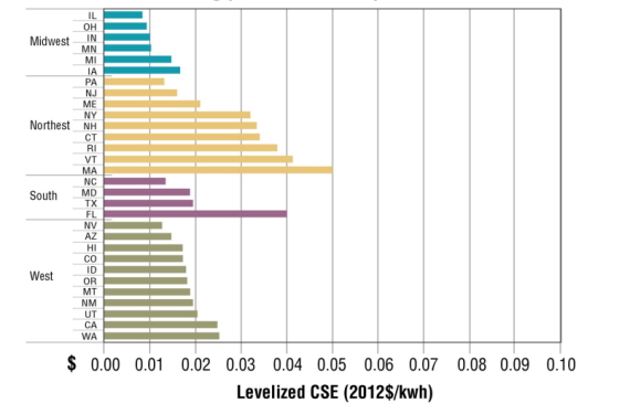 The CSE differences may have varied between types of efficiency program, but even greater differences were seen on a regional level. Energy efficiency programs in 7 Midwest states had the lowest average levelized CSE at $0.014/kWh, followed by 11 Western states at $0.023/kWh, 4 Southern states at $0.029/kWh, and 9 Northeast states at $0.033/kWh.