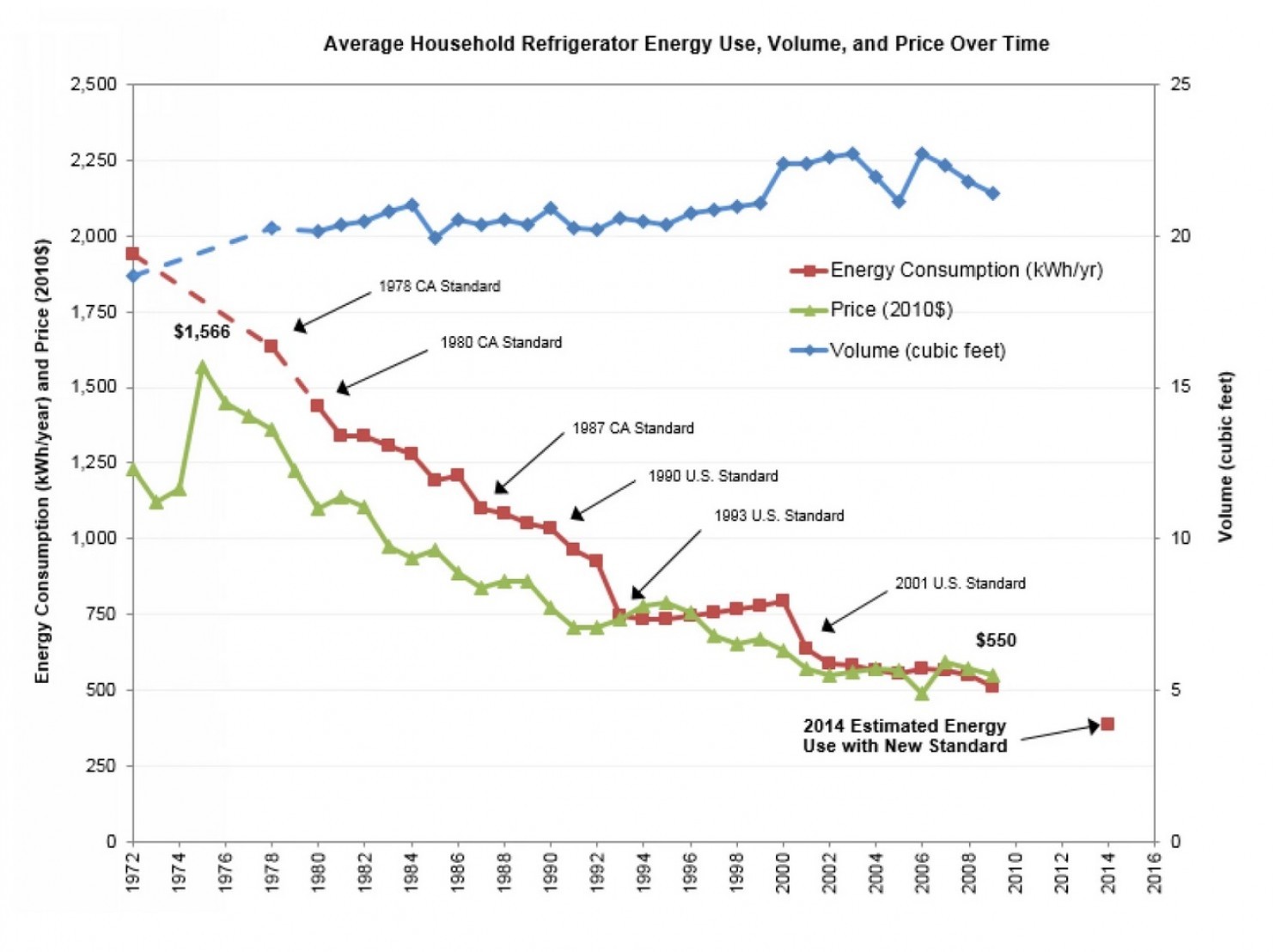 The first reason is actually kind of good news — major home appliances aren’t such power hogs any more. Many categories of in-home appliances, such as refrigerators, have gotten vastly more energy efficient over time: