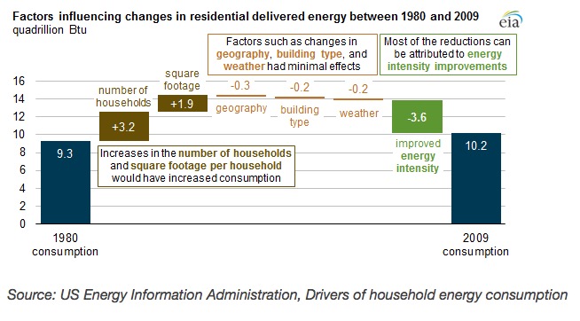 Between 1980 and 2009 (the most recent survey year), delivered energy used by US households increased from 9.3 quadrillion British thermal units (quads) to 10.2 quads, an average growth of 0.3% per year. The change in delivered energy during this period can be broken into component factors, including number of households, structural changes (the mix of housing types, the geographic distribution of households, and changes in average floor area), weather, and energy intensity (measured here as consumption per square foot). After adjusting for the effects of the other factors, 2009 energy intensity declined (improved) by about 37% compared with the level in 1980, meaning that without this change, households would have required another 3.6 quads of delivered energy in 2009. The effects of reduced energy intensity are significantly greater when considered in terms of primary energy use, which takes into account that, on average, nearly three units of energy from primary fuels such as coal, natural gas, and nuclear fuel are used to generate one unit of electricity, which is a major part of energy use in households.