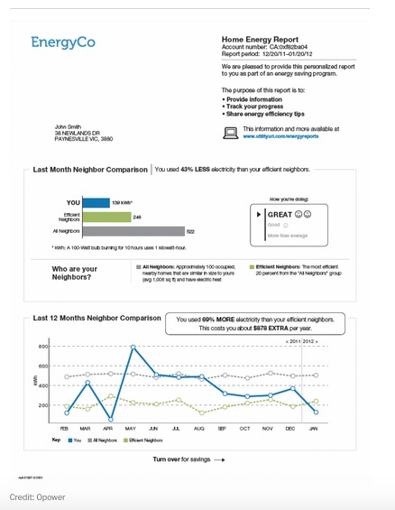 Such research led to Opower’s now famous three bar chart, mailed to many utility customers along with their bills, showing the household’s energy use and how it stacked up. Here’s a generic example, courtesy of Opower: