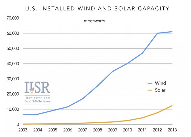 While local renewable energy and energy efficiency are both proving to be near-existential threats to electric utilities in the early 21st century, the trends aren’t the same. The rapid rise of renewable energy gets the headlines, and it’s big news. Total renewable energy capacity has grown 10-fold since 2003 and in certain parts of the country, wind and solar represent more than 20% of electricity on the grid.