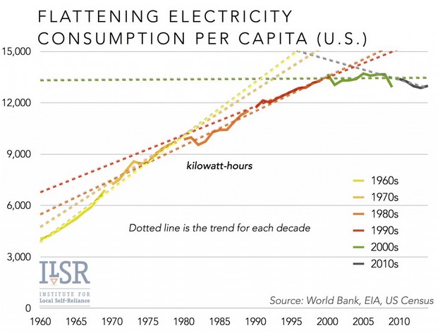 Although growth in per capita energy use has declined each decade until now, the economy made a major shift in the year 2000, from growth of approximately 100 kilowatt-hours per year per person to complete stagnation. In the 2010s, the curve has bent down and may represent a permanent shift toward stagnant or lower per capita electricity consumption.