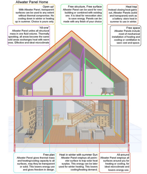 Compared with conventional heating methods, for example gas, where energy consumption is 100 per cent and the saving is 0 per cent, or even gas plus geothermal heating system which saves about 20 per cent and energy costs drop to 80 per cent, Allwater panels in conjunction with either geothermal or solar panels can supply the complete energy needs of the building – both heating and cooling – and save another 20 per cent.