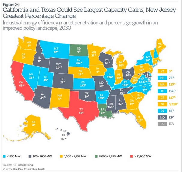 Together, the tax incentive and the Clean Power Plan are likely to boost industrial energy efficiency 27 percent for total capacity additions that reach 22.8 GW by 2030. That’s 16.1 GW of CHP and 6.7 GW of WHP, according to the report.