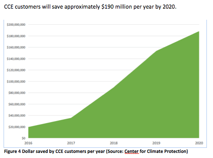 CCEs will save an estimated cumulative greenhouse gas emissions by 2020 of about 5.5 million metric tons. This numbers exceed the requirements that investor-owned utilities have to meet.