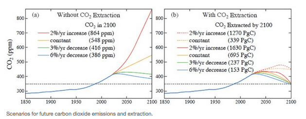 But that’s only if we make significant reductions in rates of emissions right now. If we delay, then future generations would need to extract over ten times more CO₂ beyond the end of this century.