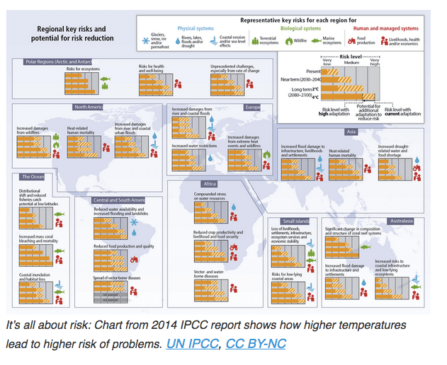 Ultimately, what should we do if we cannot make the 1.5°C or 2°C limit? The most current IPCC report shows the risks, parsed by continent, of a 2°C world, and how they are part of a continuum of risk extending from today’s climate to a 4°C.