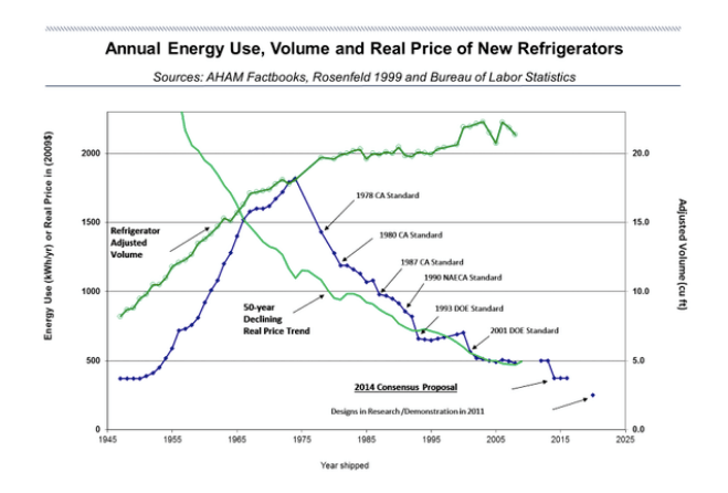 One key failure is treating efficiency measures as once-through improvements: meaning you make efficiency improvements and then you are finished with it. But whenever we have been serious about implementing efficiency, we find that market acceptance of the new measures inspires designers and manufacturers to do even better. For example, even after seven rounds of successive refrigerator efficiency standards that cut energy use for comparable products by over 85 percent since 1972, there is still the potential to save 15 to 30 percent more.