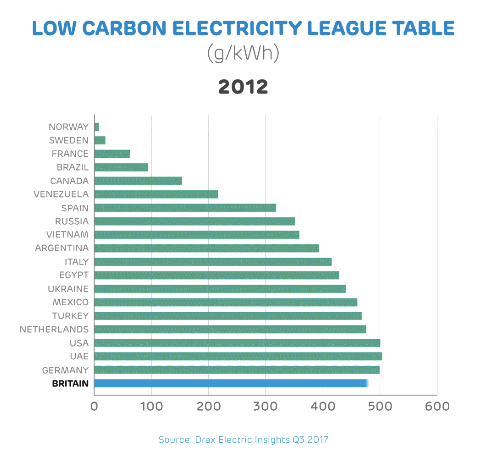 The fresh research shows that Britain has climbed from a 2012 ranking of 20th out of 33 industrialised countries to 7th on the low-carbon electricity league table.