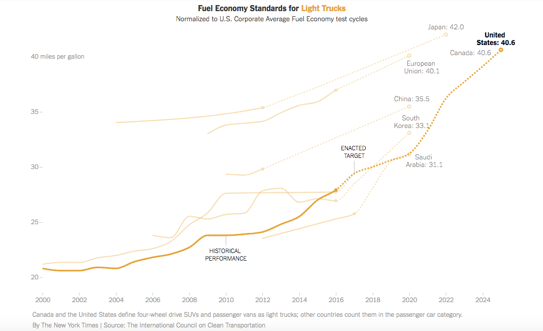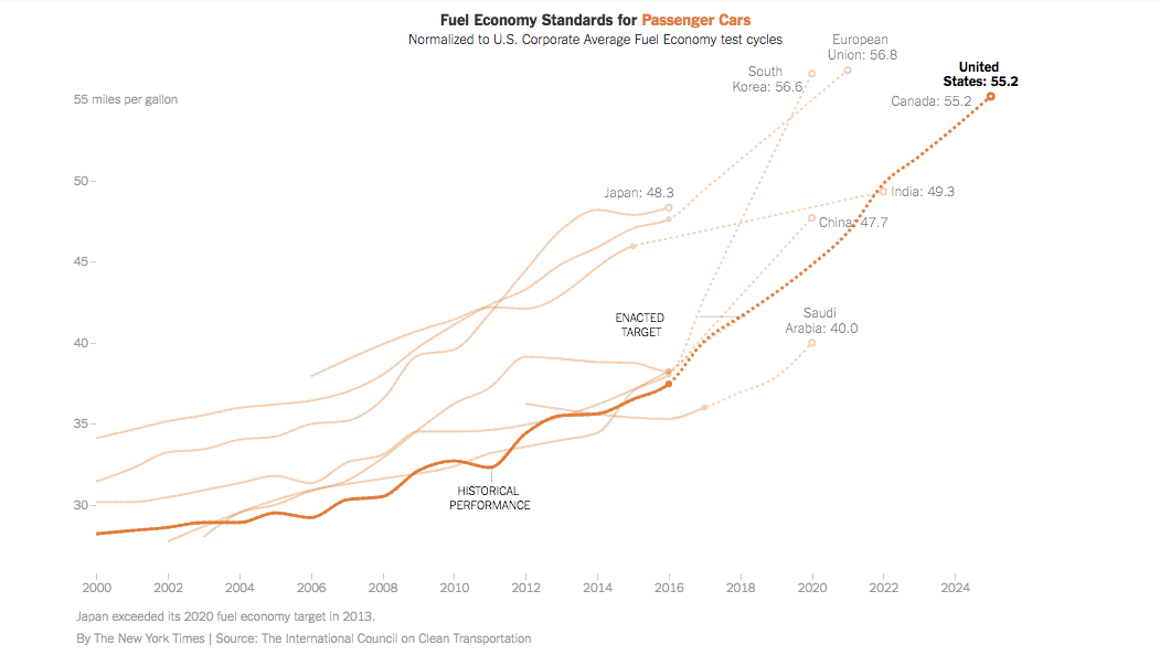 It is not often we see direct comparisons amongst countries for their fuel economy standards. Brad Plumer and Nadja Popovich recently published an article in the New York Times that provided some useful graphs comparing various countries and regions with projections for several years. You should find this quite valuable.