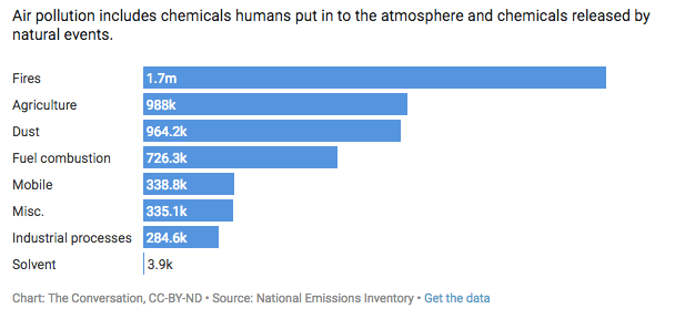 While these are important sources of air pollution, there are many others. Air pollution includes chemicals humans put into the atmosphere and chemicals released by natural events. For example, forest fires are a large source of air pollutants that affect many communities. Dust that’s picked up by wind can also contribute to poor air quality.