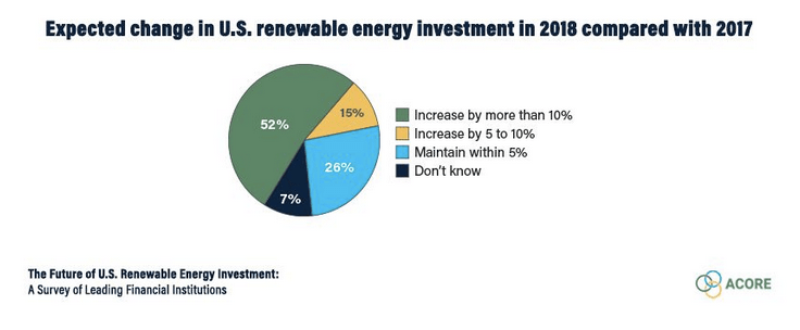 Two-thirds of respondents said they plan to increase their investments in U.S. renewables by more than 5 percent in 2018 compared with 2017, and half plan to increase their investments by more than 10 percent. None said they plan to decrease renewable energy investment by any more than 5 percent.