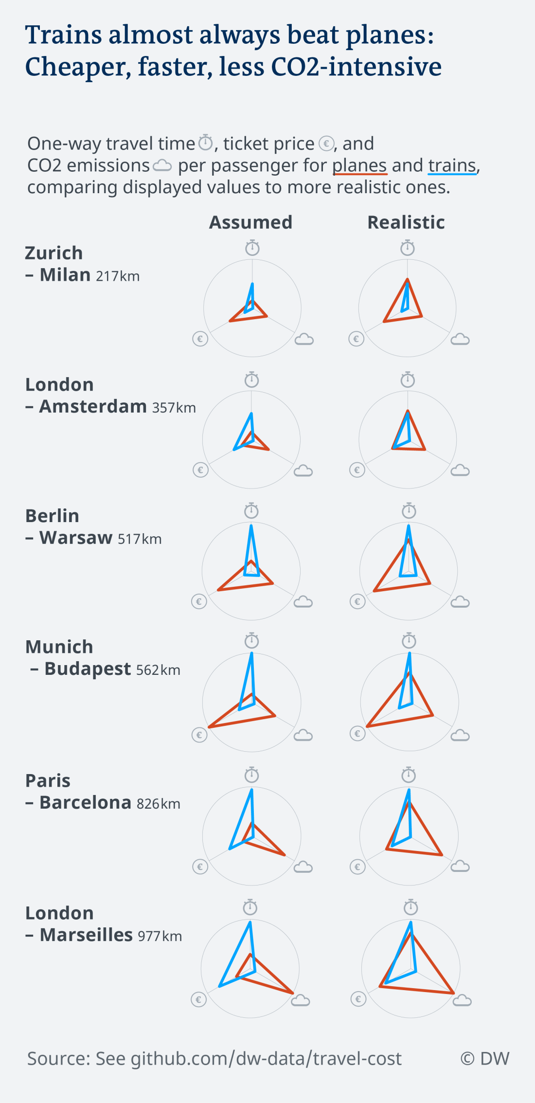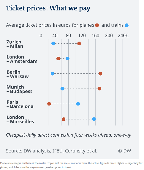 In order to calculate the real costs of travel, DW has collected thousands of ticket prices, journey times and CO2 emissions figures for trains and planes on six direct routes between European cities: Berlin-Warsaw, Munich-Budapest, London-Amsterdam, London-Marseilles, Paris-Barcelona and Zurich-Milan.