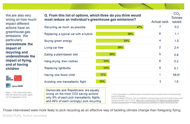 The rarity of flying explains why, despite aviation’s relatively limited contribution to emissions, one of the most effective actions a person can take is to fly less. A study by Swedish academics puts skipping one transatlantic flight as the third most effective action someone can take, only behind having one less child and living entirely car free. But only 10% of the US public pick out skipping the flight as one of the top three. Instead, 45% thought recycling as much as possible is a priority for reducing emissions – a much less effective action than giving up just one flight.