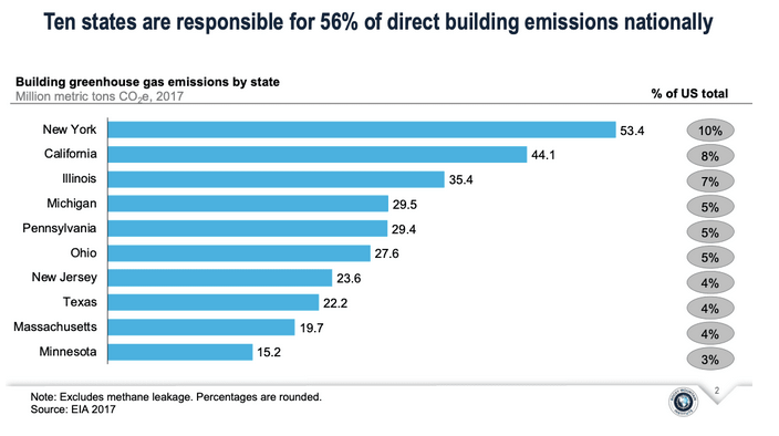 Burning gas along with smaller amounts of oil and propane in buildings accounts for 10 percent of total US economy-wide emissions, and only ten large states are responsible for 56 percent of those emissions.