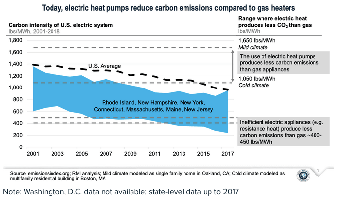 Today, in each of these climate-ambitious states, electrifying air heating and cooling with air-source heat pumps will immediately reduce emissions when compared to gas, oil, and propane alternatives– even in the coldest, most heating-intensive climates. In addition, all of these states still need to reduce gas consumption in existing buildings.