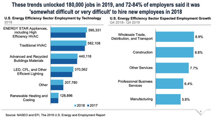 These targets are daunting, but they also present one of the largest opportunities for job creation in our economy today. Research published this year suggests that the trend toward electrification and building efficiency created 180,000 jobs in 2019, with 5.8–9.9 percent annual growth in 2019, far outpacing other sectors. We expect these trends to continue as states begin to require all-electric new construction, and as more customers learn about and adopt lower-carbon, lower-cost electric alternatives for heating, cooling, and cooking.