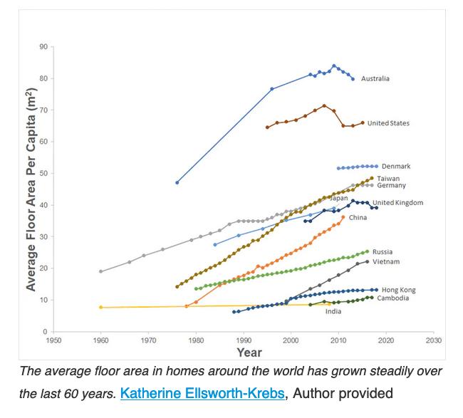 Nonetheless, there are also implications for household carbon footprints. In a nutshell, more space per person is more space to heat per person.