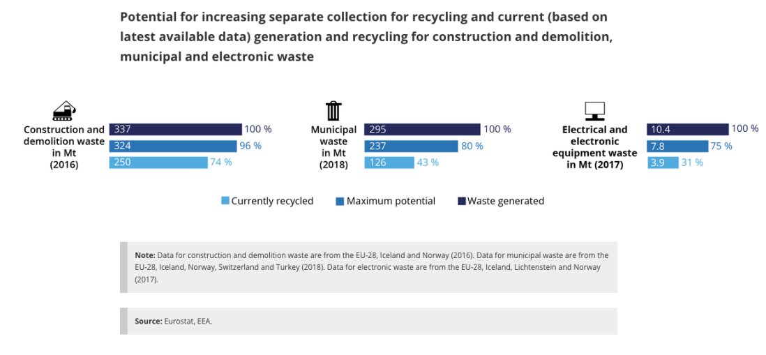 There is significant potential to increase recycling across Europe for municipal, construction and electronic waste according to a European Environment Agency briefing released this week. Compared to current recycled amounts, this potential can double recycling for municipal and electronic waste and increase it by 30 % for construction and demolition waste.
