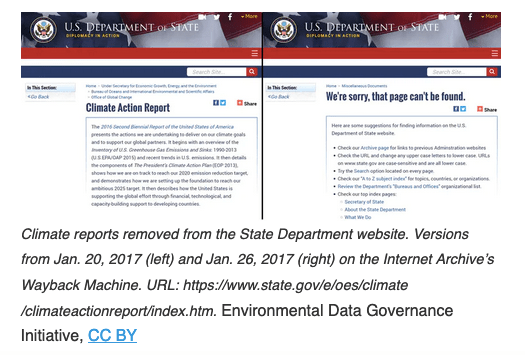 The State Department’s Office of Global Change, for instance, no longer publishes Climate Action Reports, which the U.S. is obliged to produce under the United Nations Framework Convention on Climate Change. The reports can no longer be found at their former addresses. Instead, they are archived at new addresses in the Department’s Obama-era web archive, making the reports more difficult for the public to access.