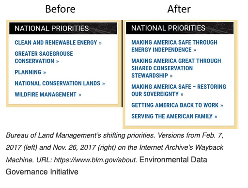 In other cases, language has been changed to reflect the new administration’s agenda. For example, the Bureau of Land Management removed “Clean and Renewable Energy” from its list of national priorities, adding “Making America Safe Through Energy Independence” and “Getting America Back to Work” instead.