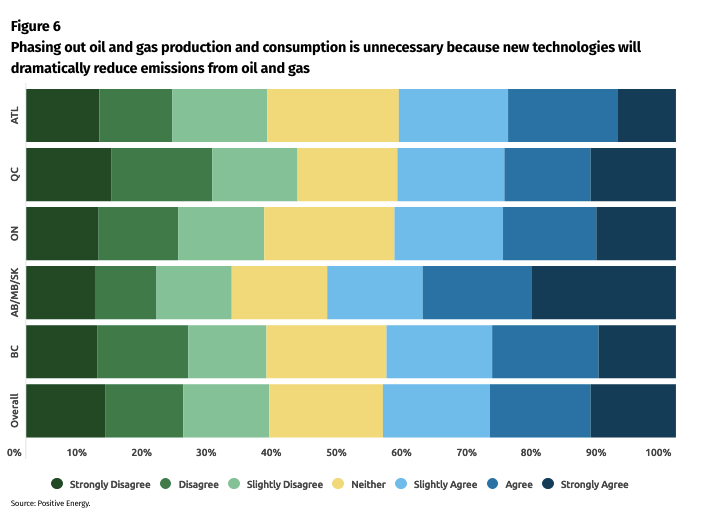 In contrast to expanding oil and gas production, a potential phase-out of oil and gas is predictably controversial. When asked if phasing out oil and gas is necessary (figure 6), opinion is fragmented overall. Forty-one percent of Canadians at least slightly agree that technological improvements will render a phase-out unnecessary, while 34 percent at least slightly disagree. More Canadians in the Prairies tend to agree with this statement, but there is moderate agreement on this issue across regional lines.