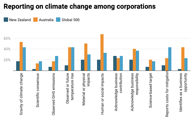 A previous study also shows only 5–16% of the 200 largest corporations in New Zealand report climate risks, emission-reduction targets or climate-related initiatives in their annual reports or financial statements.