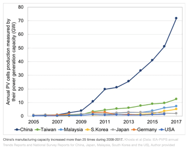 Second is the need to reinforce complementary links between the global economy and domestic technology choices. For example, India was able to accelerate its LED market because its bulk procurement and bulb distribution policies complemented access to China’s large scale low-cost LED manufacturing. Equally, China’s early domestic support for export-oriented hi-tech manufacturing complemented the growing demand for solar cells in Germany.