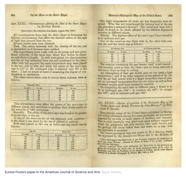 Foote’s discovery of the high heat absorption of carbon dioxide gas led her to conclude that “… if the air had mixed with it a higher proportion of carbon dioxide than at present, an increased temperature” would result.