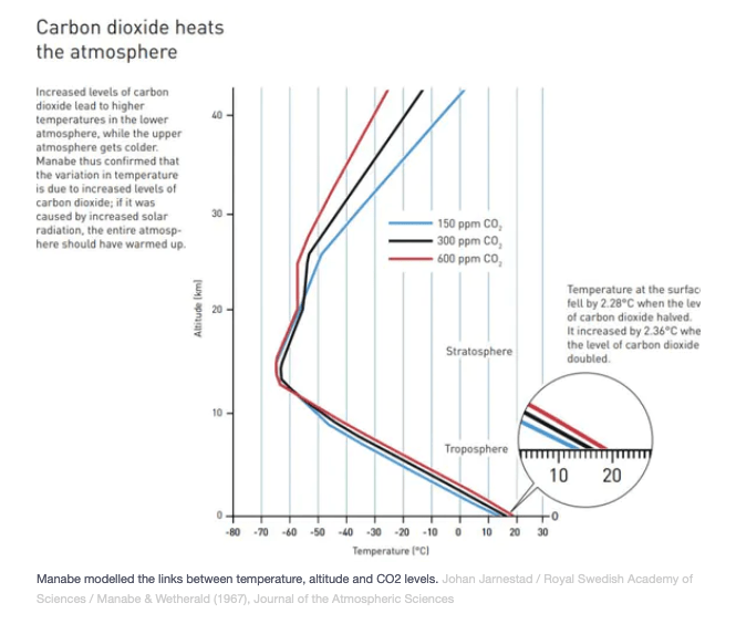 Their first such climate-change experiment wasn’t to look at the role of carbon dioxide, but was to look at the effects of water vapour injected high into the stratosphere from a potential fleet of supersonic jets, as this and a possible nuclear winter were the immediate concerns of the time. However, their Table 5 goes down in history as the first robust estimate of how much the world would warm if carbon dioxide concentrations doubled. Manabe and Wetherald estimated 2.36℃ of warming, not far off today’s best estimate of 3℃.