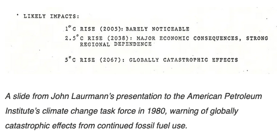 In 1980, the task force invited a scientist from Stanford University, John Laurmann, to brief them on the state of climate science. Today, we have a copy of Laurmann’s presentation, which warned that if fossil fuels continued to be used, global warming would be “barely noticeable” by 2005, but by the 2060s would have “globally catastrophic effects.” That same year, the American Petroleum Institute called on governments to triple coal production worldwide, insisting there would be no negative consequences despite what it knew internally.