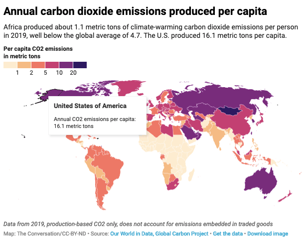 For example, China is currently the single largest greenhouse gas emitter by country. However, Saudi Arabia, the United Arab Emirates, the U.S., Australia and Canada all have more than twice the per capita emissions of China. And they each have more than 100 times the per capita emissions of several countries in Africa.