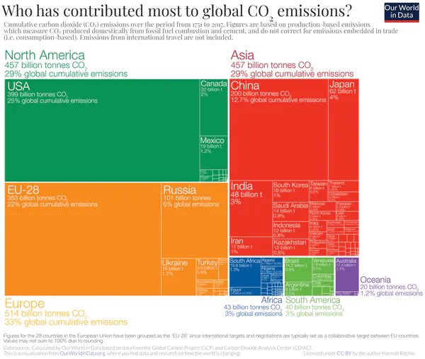 For instance, the United States has emitted over a quarter of all greenhouse gases since the 1750s, while the entire continent of Africa has emitted only about 3%.