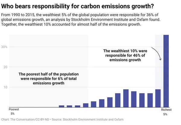 From this perspective, thinking about climate justice requires attention to patterns of wealth. A study by the Stockholm Environment Institute and Oxfam found that 5% of the world’s population was responsible for 36% of the greenhouse gases from 1990-2015. The poorest half of the population was responsible for less than 6%.