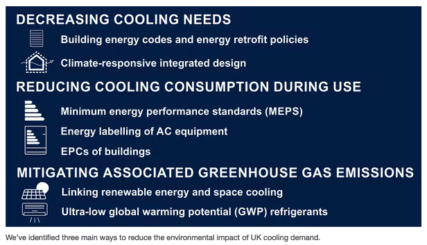 At the moment, reducing cooling energy demand is not explicitly part of energy policies for buildings in the UK. There need to be specific regulations making buildings comfortable to live and work in without needing extra cooling devices installed.