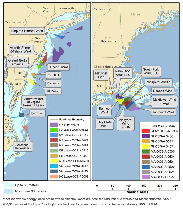 Off the Massachusetts and New York coasts, developers are preparing to build the United States’ first federally approved utility-scale offshore wind farms – 74 turbines in all that could power 470,000 homes. More than a dozen other offshore wind projects are awaiting approval along the Eastern Seaboard.