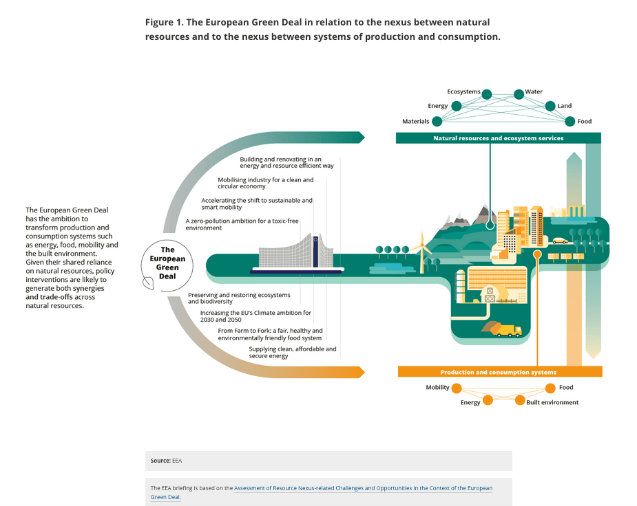 Europe’s drive towards sustainability would benefit from a wider and joint approach to the use of the vital resources that underpin the functioning of core production and consumption systems according to the EEA briefing ‘Resource nexus and the European Green Deal’ .