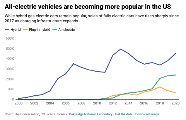 As manufacturers introduce new models of electric vehicles, demand for them is growing steadily. New EV sales in the U.S. roughly doubled in 2021 and could double again in 2022, from 600,000 to 1.2 million. Auto industry leaders expect that EVs could account for at least half of all new U.S. car sales by the end of the decade.