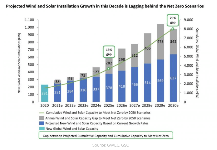 Yet, despite the remarkable growth rates, a joint study by the Global Solar Council and the Global Wind Energy Council found that there will be a 29% shortfall in the projected wind and solar capacity required in this decade to keep the world on a net-zero pathway.